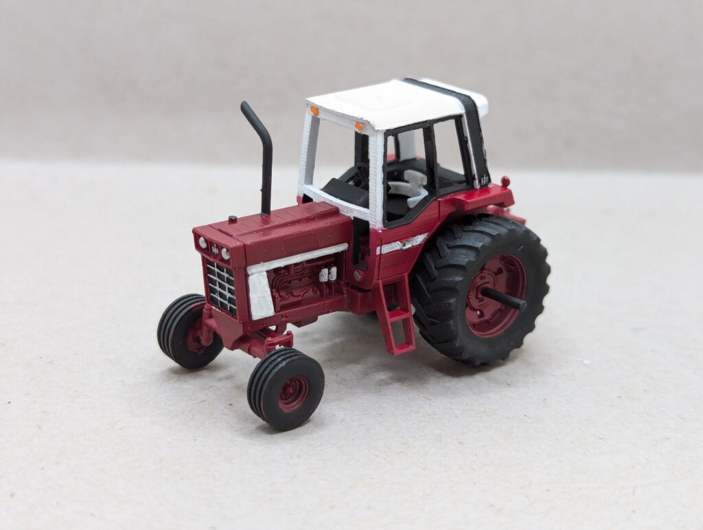 N Red 86 Tractor wide front with duals Kit comes with cab and front weights that can be added if desired. High detailed parts, such as the interior levers are very fragile. Kit comes unpainted.
